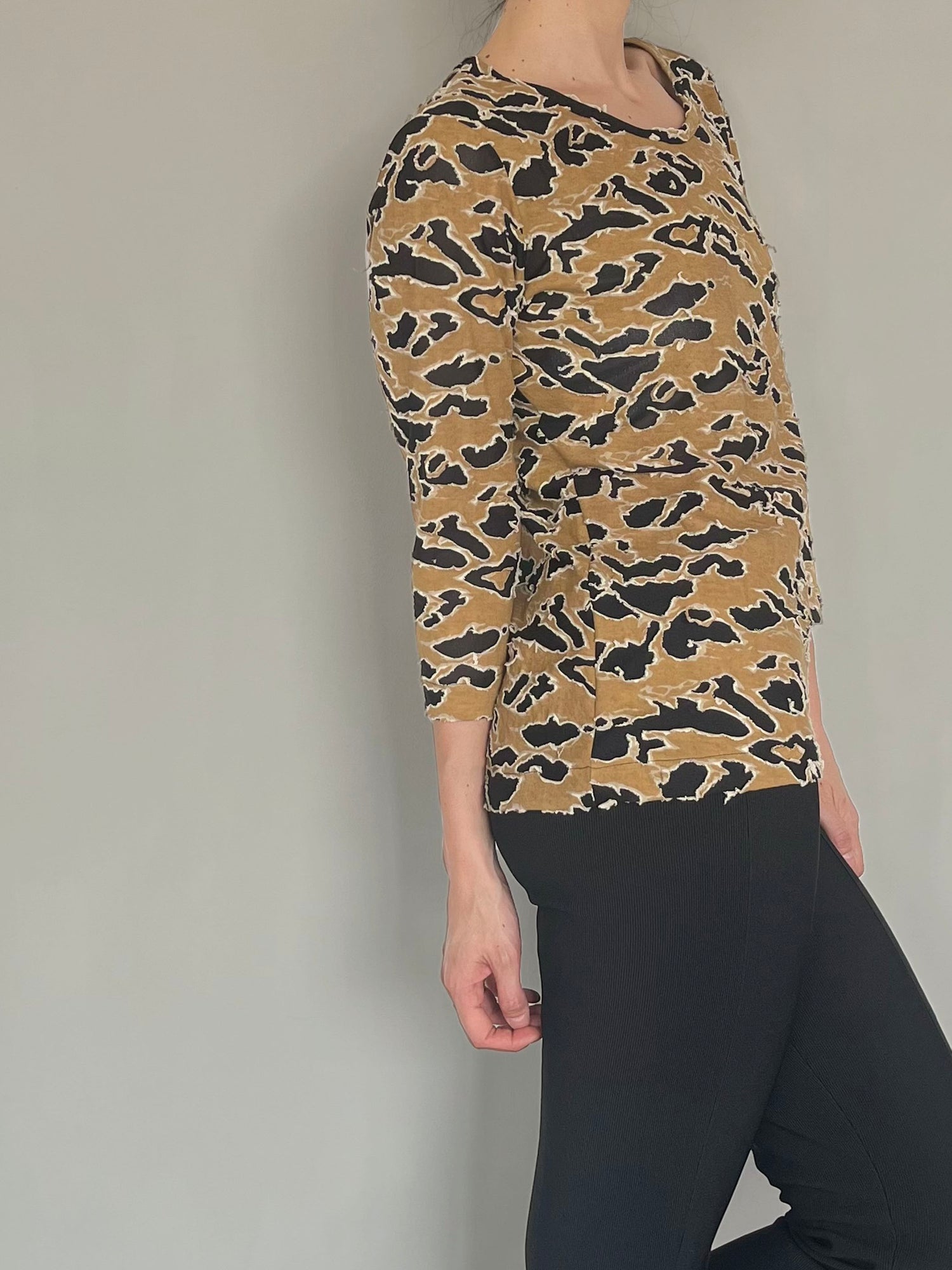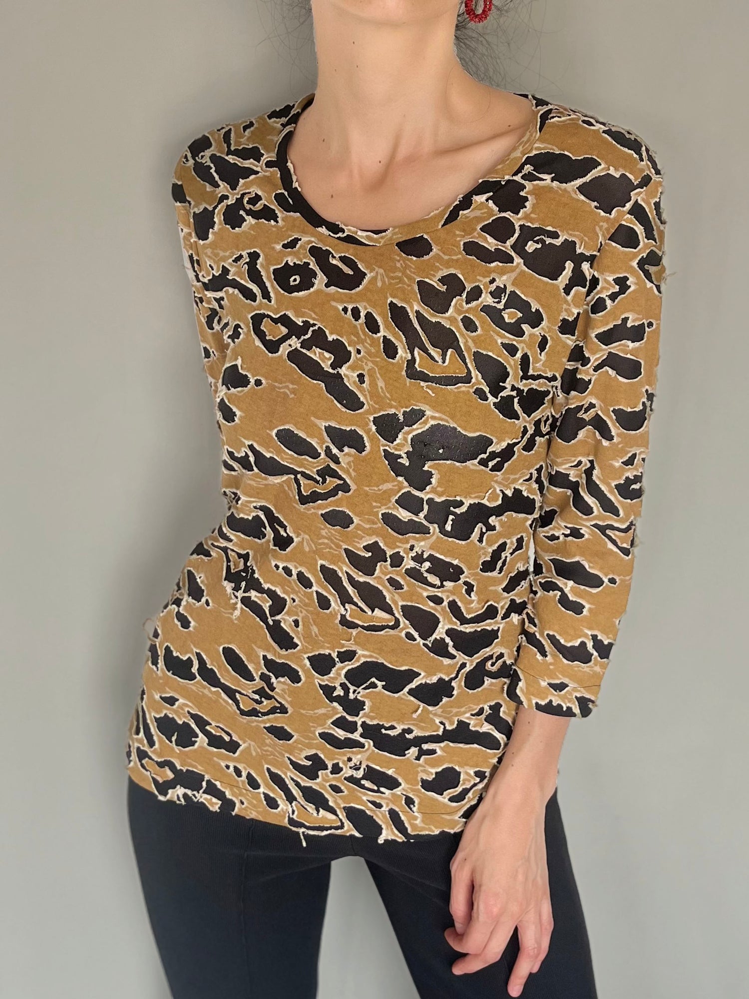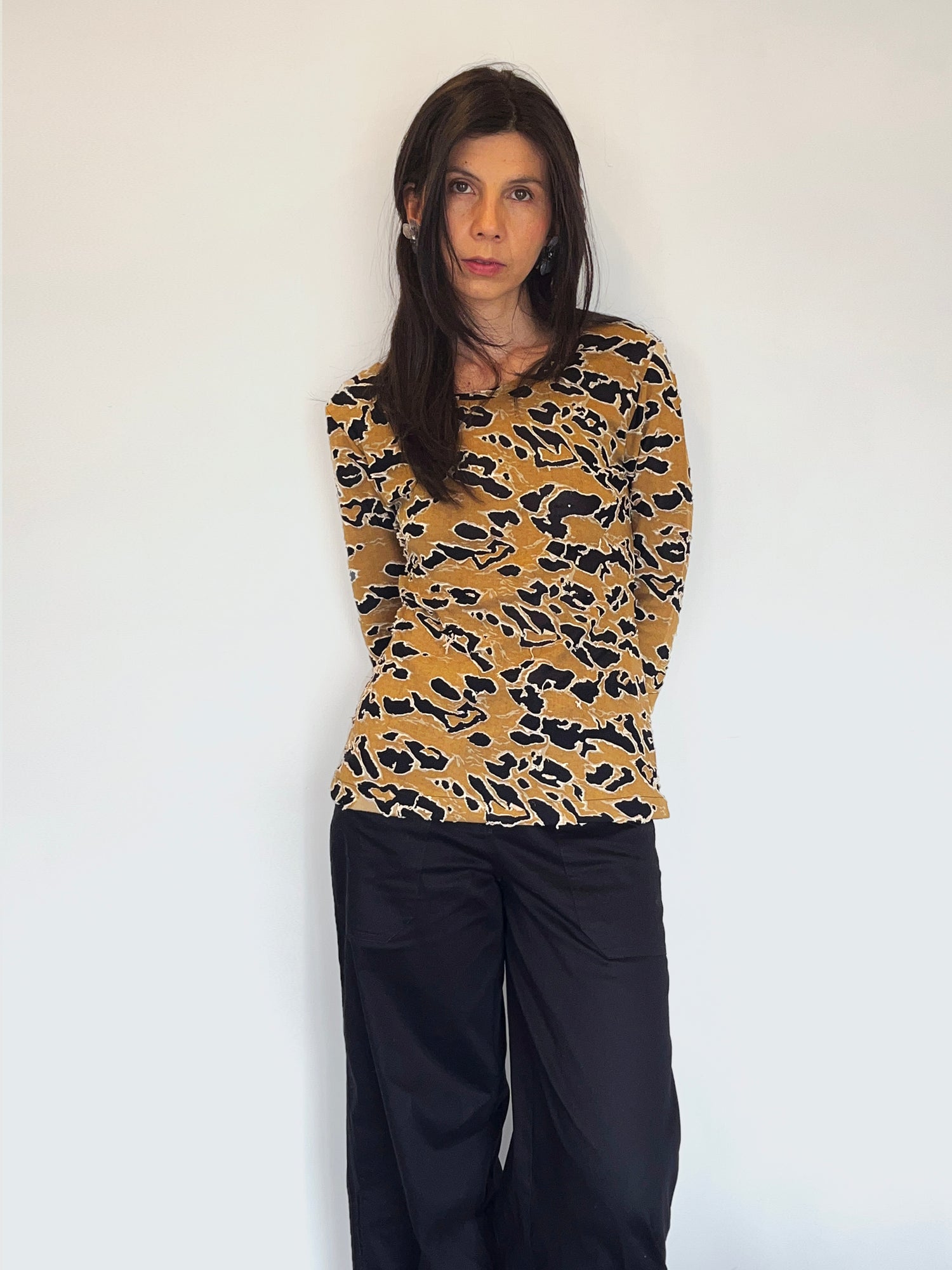 Ligeramente licrada de cuello redondo y manga tres cuartos. Su textura es 100% look Maconga y es un complemento perfecto para tus looks Terracota.
