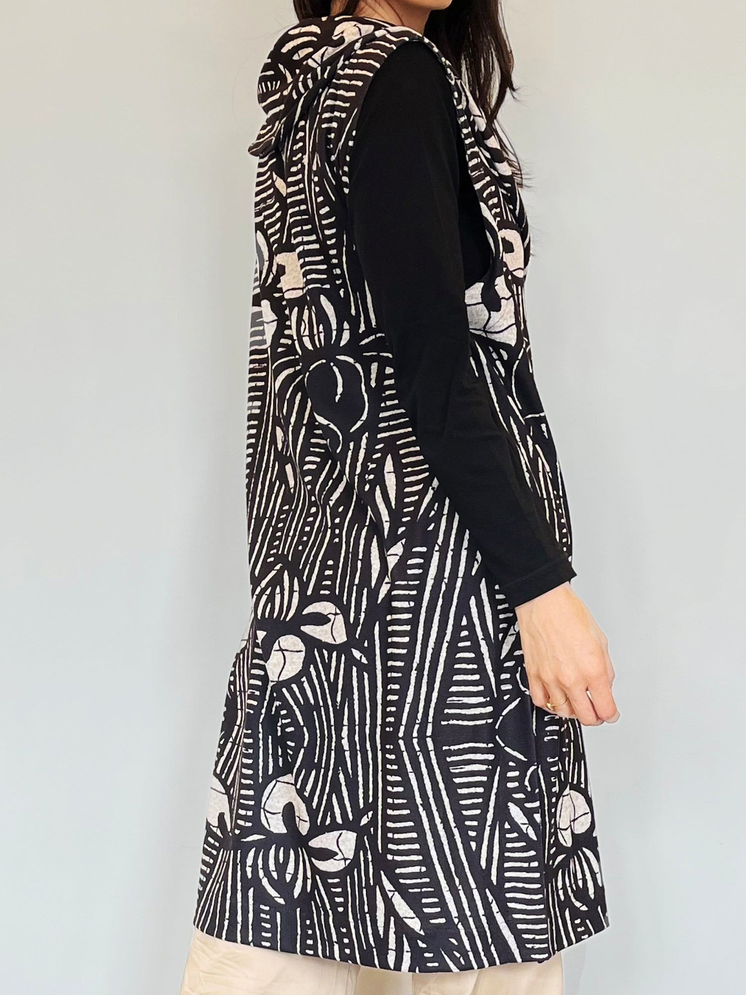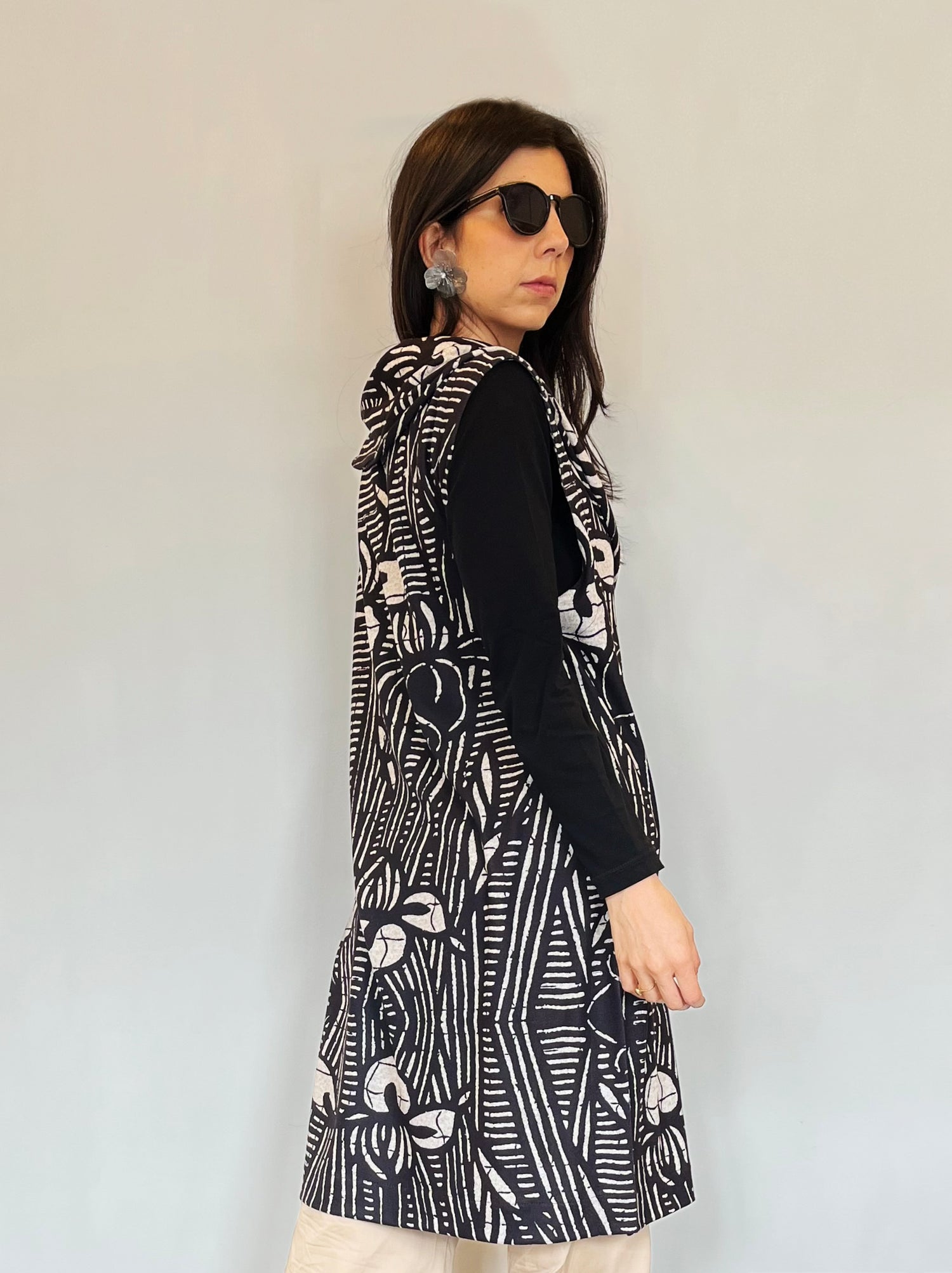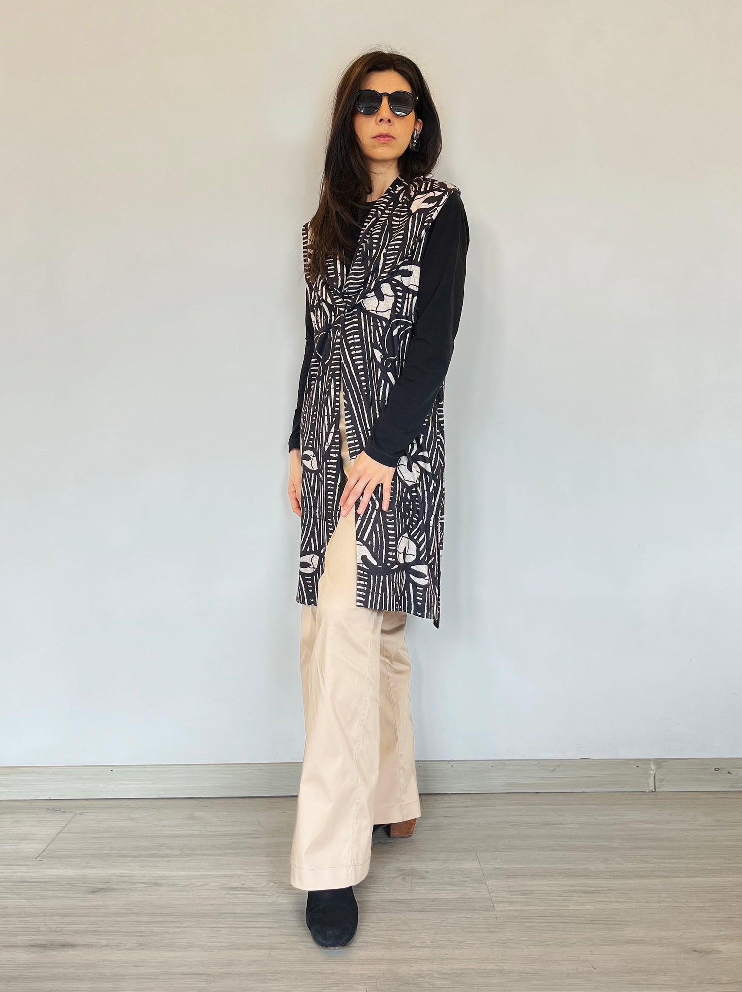 Chaleco largo y fluido, inspirado en las pinturas precolombinas y el arte de las molas. Abrigado pero liviano, elaborado en 100% poliéster. Una pieza versátil que combina historia y modernidad dentro de la colección Terracota