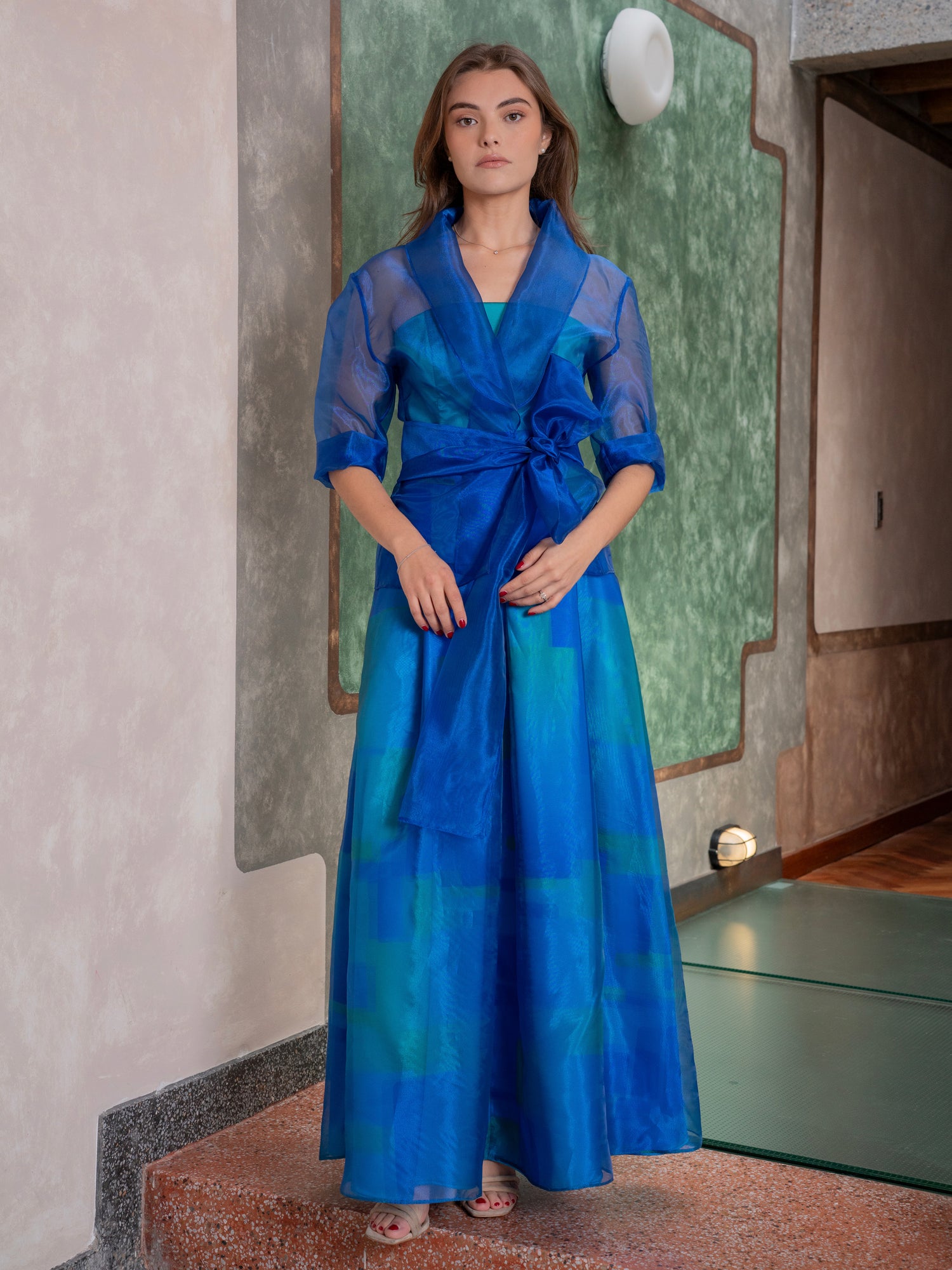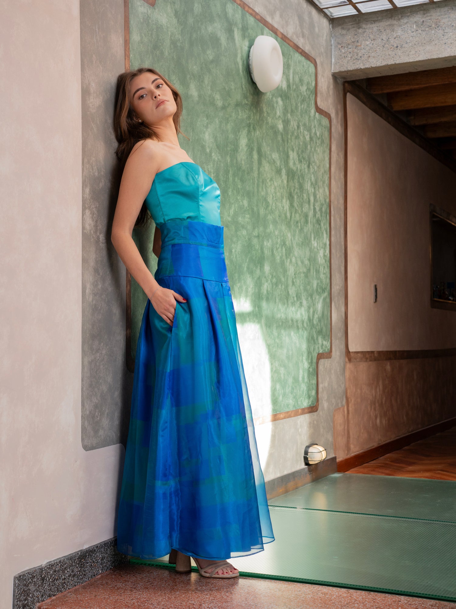 Tres piezas que arman un look perfecto. Una camisa en organza para cubrirte en los primeros momentos del evento y las ceremonias. Un corset perfecto en drill y organza para destacar tu silueta con pinzas que detallan tu figura. Una falda en doble tela (drill y organza) estampada en tonos azules y verdes. Juntas crean el vestido perfecto y separadas son versátiles para combinar con otras prendas de tu armario.