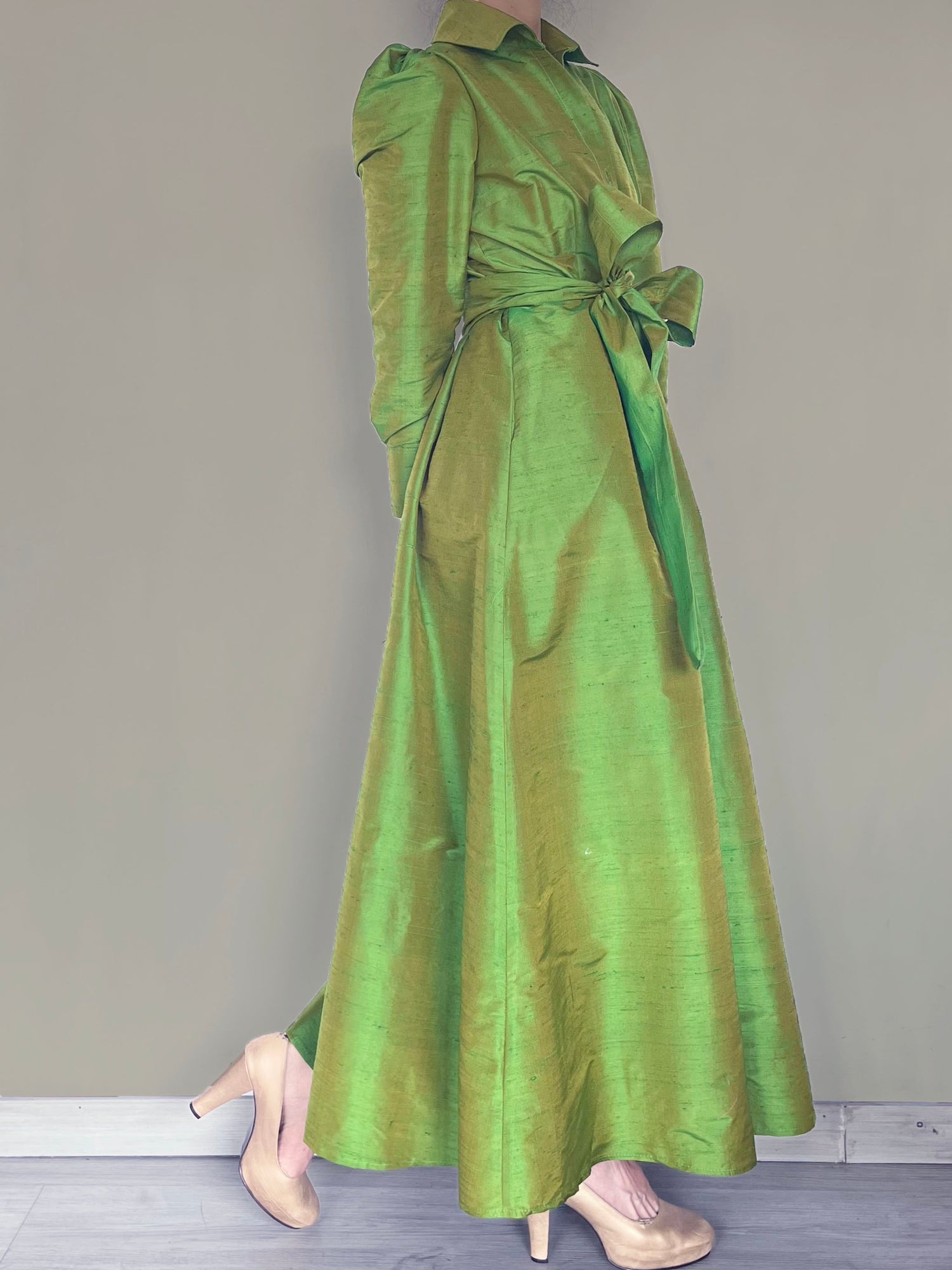 Contrastando con los colores neutros llega este verde a darle vida a tu armario, es un vestido camisero con fajón. Esta confeccionado en shantú de seda 100%.